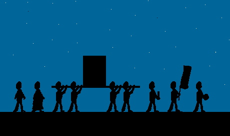 | むかし、あったてんがな。 あるひとりもんの男がしんせきの家で酒をいっぺ(たくさん)のんで帰る途中、向こうからそうしきの列がやってきたんと。 何人もの村しょ(村人)がしずしずと歩いてきたがや。 知っている人ばかりだったんで、 「おい、だれのそうしきらね。」 と聞いたんやが、だれも教えてくれんかったと。 それで、男はあとをついて行ったんと。 そうしきの列は村はずれの寺につくと、かんおけをかついで寺のまわりを3回まわったんと。ほうして、ぼちに行き、おんおけをおろしたと。 村しょはうめる穴をほり、かんおけをその穴に入れたんと。 おかしなことに、土をかけんと、そのまま村しょは帰ってしまったんやて。 男は、だれが死んだのか知りたくて、その穴に入り、かんおけを開けたんと。ほうしたら、自分がそこにいたんやて。 男はぶったまげて、逃げ帰ったと。 と中にほそい橋があってのう。酒をのんでた上にあわてていたんで、足をすべらし川に落ちてしまったんと。 川の水は少なくて、石に男は頭をぶっつけてしまったと。 男は、春の星空をながめながら死んでしまったんと。 いちごブラーンとさがった。 |